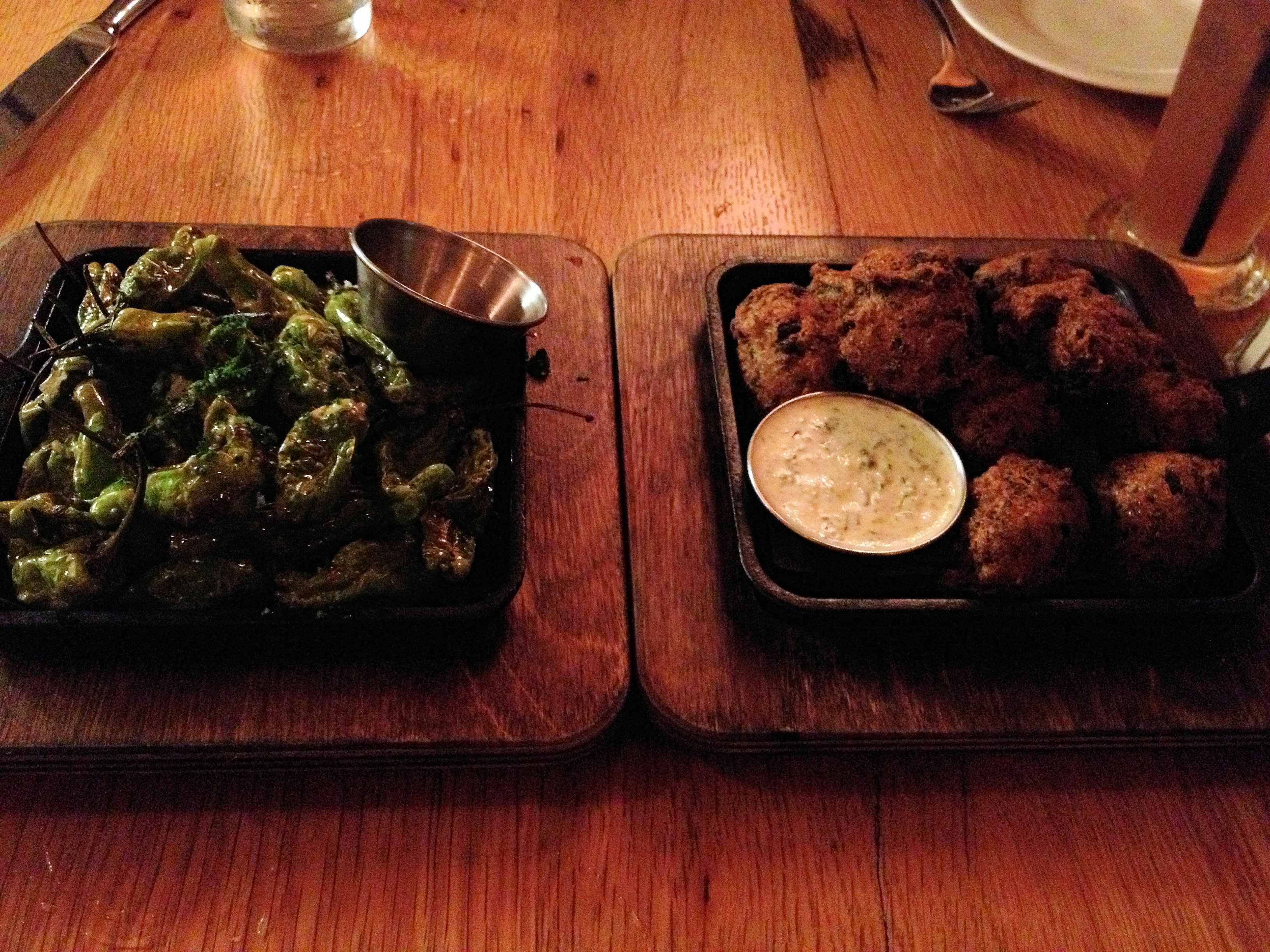 I kept things at two nibbles (blistered shishito peppers and escargot hush puppies), and two appetizers (steak tartare with spuds and goat cheese and beet mountain pie) to start off. All were good…the peppers were subtle (although I found the provided hush puppies sauce also went well with them), and the other dishes were quite flavorful and creative.
