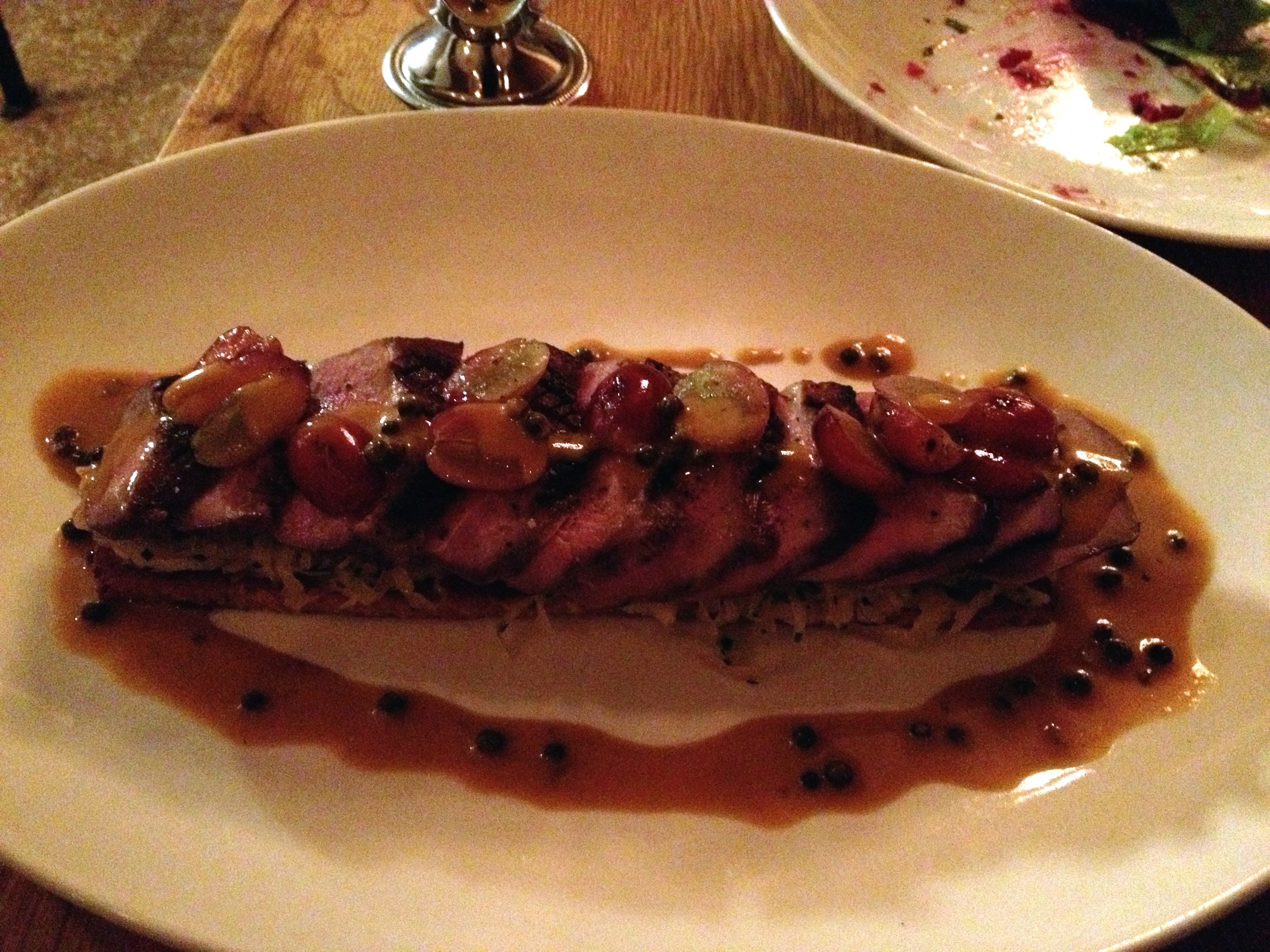 The duck breast “au poivre” with minute sauerkraut, which I ordered for my entree, was excellent. Well-prepared duck paired well with the pepper sauce and bed of sauerkraut.
