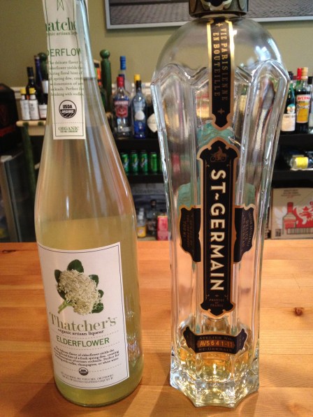 I stopped by the liquor store today to replace my bottle of St. Germain. Inquiring into the lack of bottles on the shelf, the ABC employee asked if I’d be interested in Thatcher’s brand Elderflower liqueur. This was the first time I had heard of it, and seeing that a bottle of Thatcher’s was a bit cheaper than St. Germain (about $20 for Thatcher’s versus $38 for St. Germain), I figured I didn’t have much to lose by trying it out.