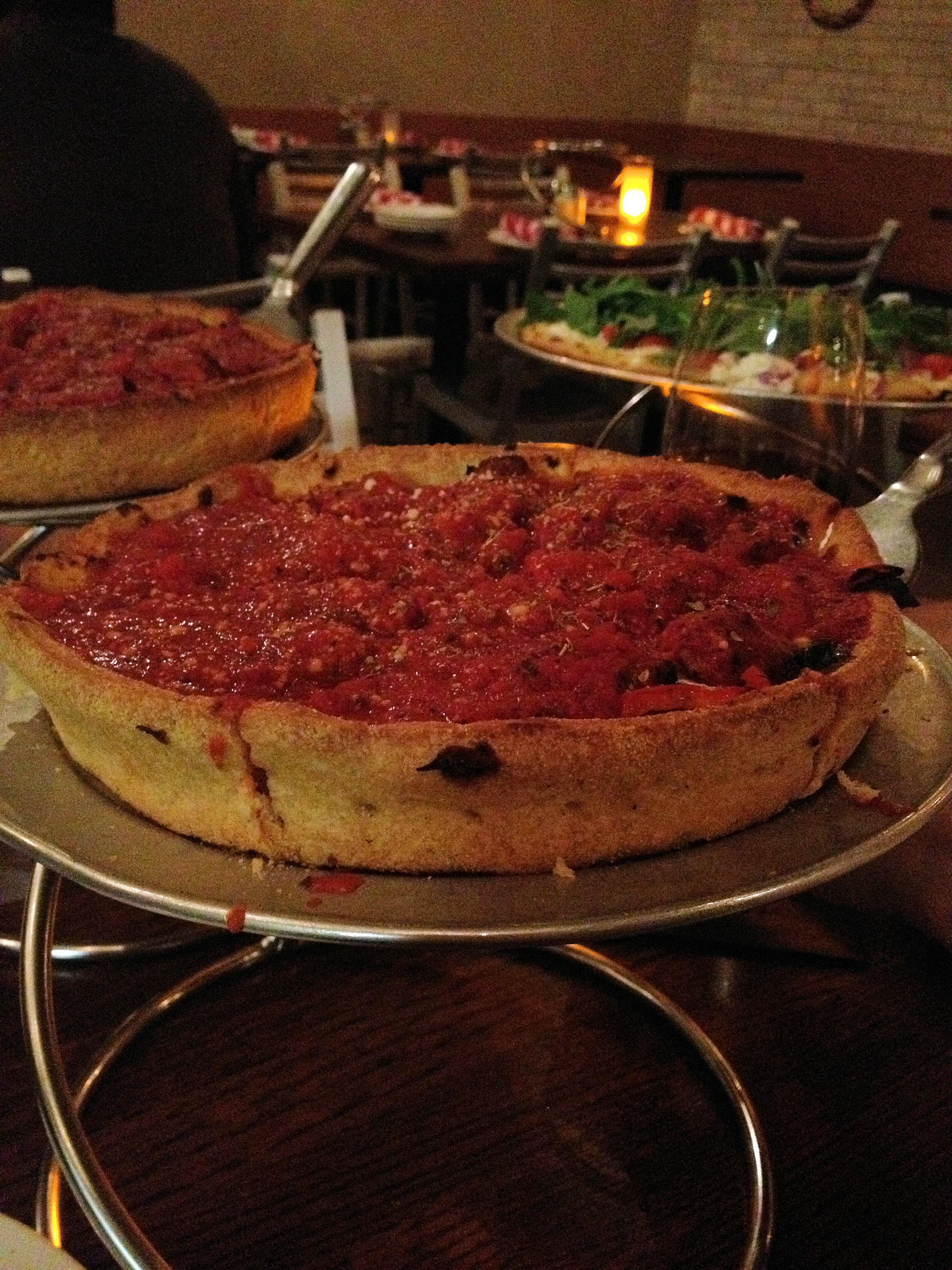 The pizza was really good.  I ordered a small 9″ (large is 12″) deep-dish pizza called the Kirkwood, which included mozzarella, italian pork and beef meatballs, red peppers, and basil.  District of Pi’s deep-dish pizzas are made with the cheese on the bottom, the rest of the ingredients, then the chunky tomato sauce on the top.  Our server, Stephen, said the Kirkwood was his favorite, and it did not disappoint.