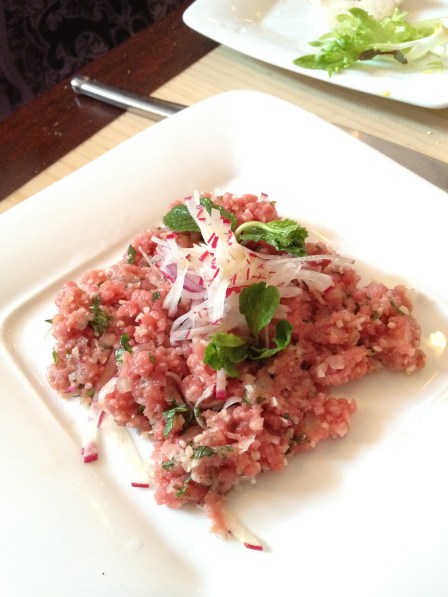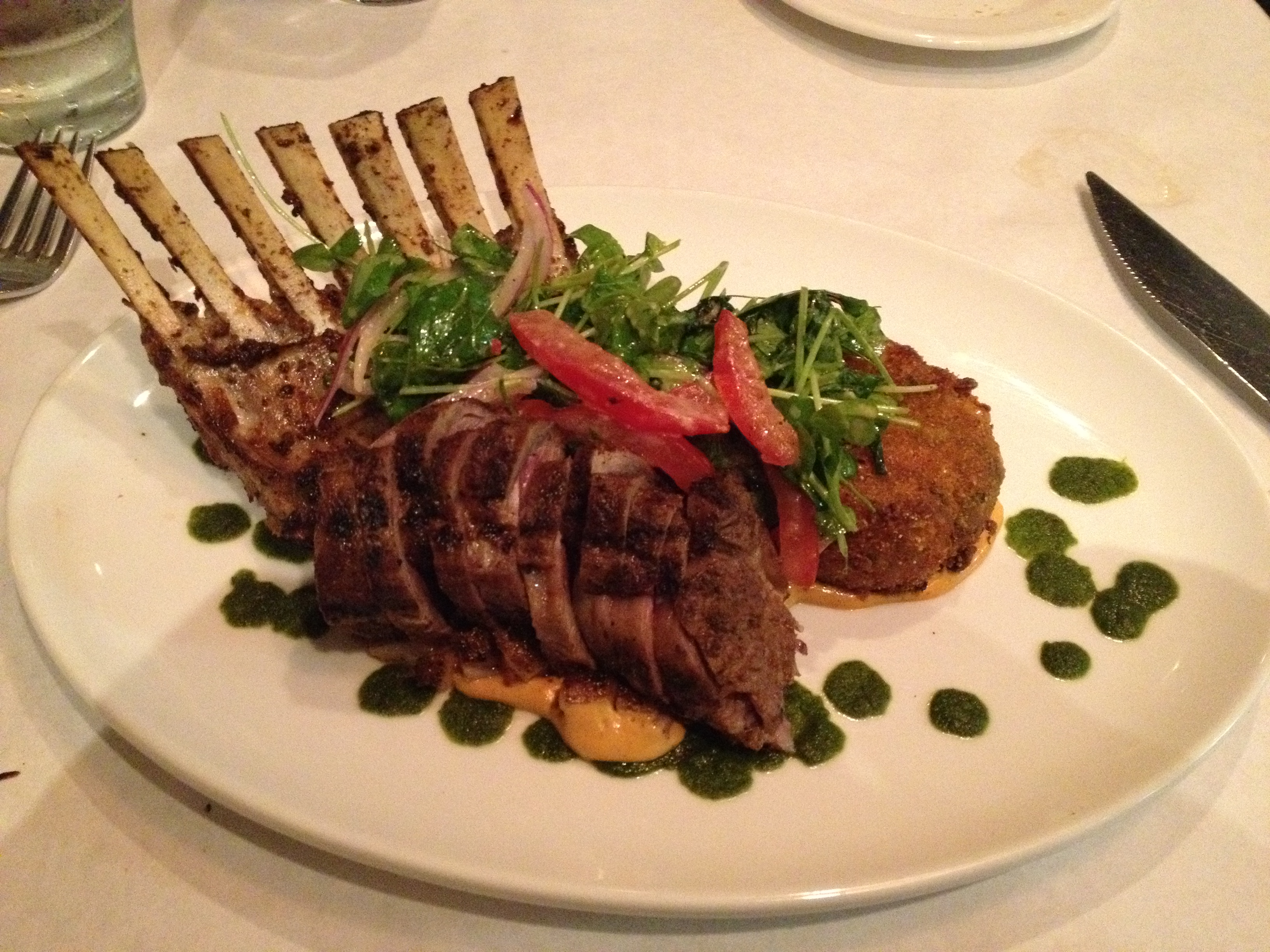 After all that, I hit the entree. This particular evening, there was an upgrade available…for an additional $50, you could change the main course, regularly an Herb Roasted Elysian Fields Lamb Ribeye, with a well-marbled Grilled Ribeye of Miyazaki Kuroge Beef, served with Potato Bone Marrow, Beef Tartare, Roasted Scallions, and Sundrid Tomato Panade. Naturally, I did that (while my dining companion went with the lamb). Both were excellent and quite different dishes, although the supplemental price increase was steep. Both dishes paired with a 2008 Torroja Des de Dins blend of Grenache/Cab/Syrah from Mayol Viticultors.