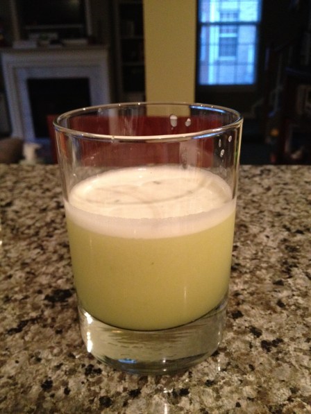 1 1/2 oz. Bulleit Rye 3/4 oz. lemon juice 1/2 oz. strawberry simple syrup 1/2 oz. Lucid Absinthe 2 dash Angostura bittersShook all but the bitters with ice. Double strained into a glass. I think I’d like this better with a little less absinthe, although it grew on me…anise taste at the front, finishes with the strawberry.