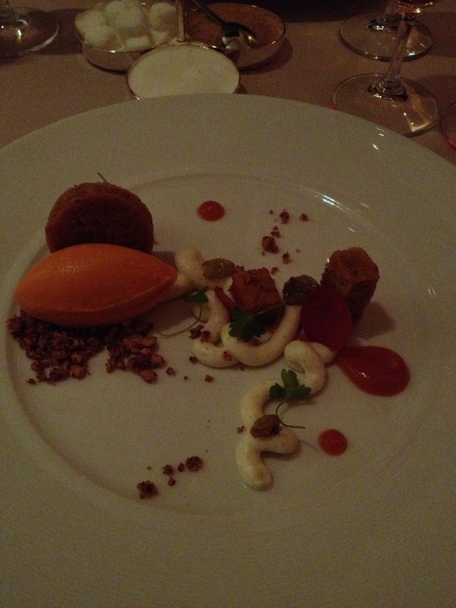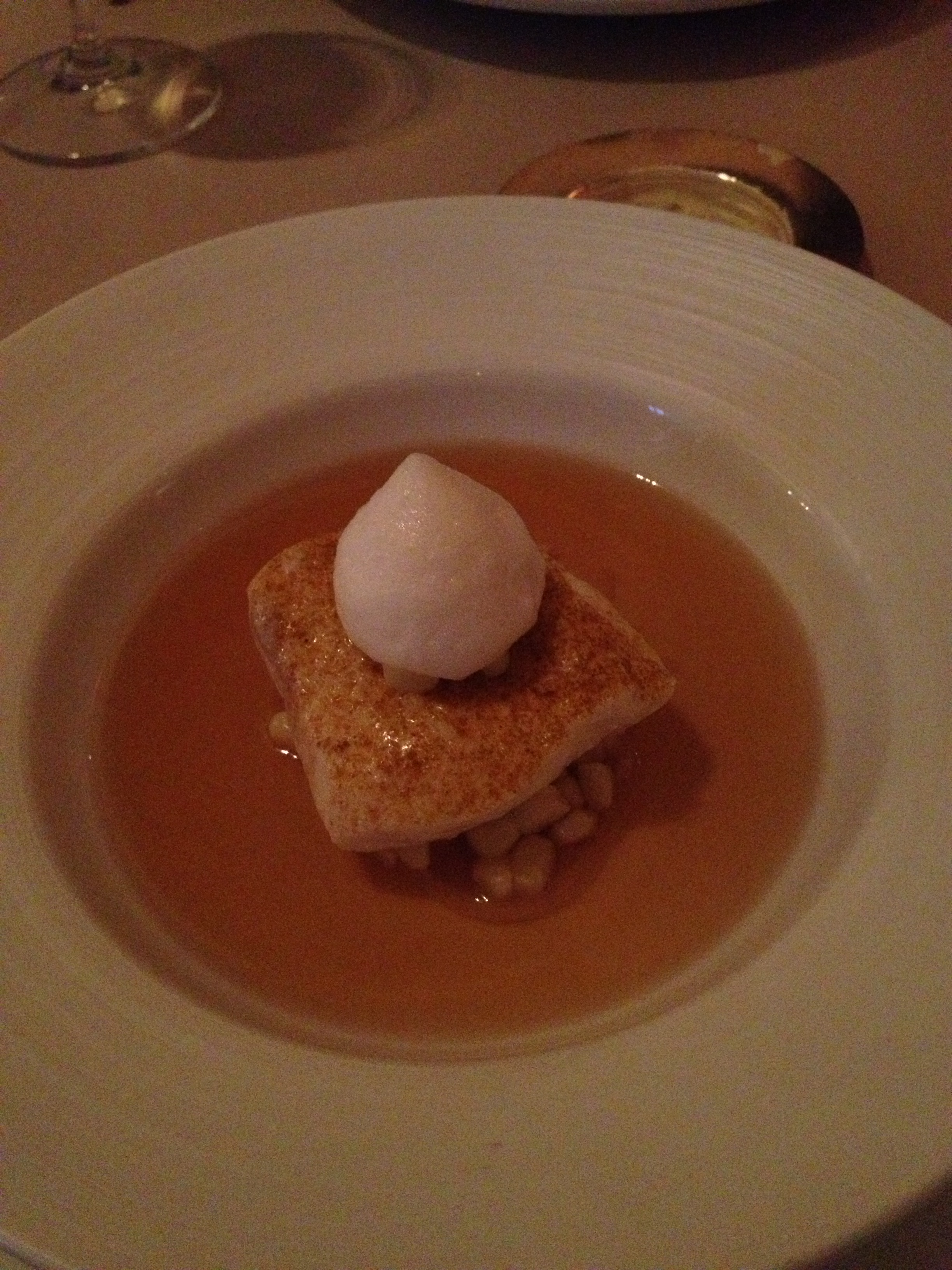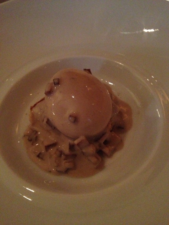The final four dishes I went with were Nigiri-style – the Tuna ‘Hot Night’ gunkanmaki (spicy tuna, sliced chilies, sesame chili oil), Wagyu Beef Nigiri (with crispy shallots and a dark rum glaze – the beef replaced the nori as the wrap around the roll), Eel Nigiri Kabayaki (barbequed eel, sesame purée [reminiscent of peaut butter], and Granny Smith apple), and the Nigiri ‘Surf & Turf’ (more Wagyu beef, along with Sockeye salmon, scallion, ginger, and sweet miso vinegar). Great rolls.